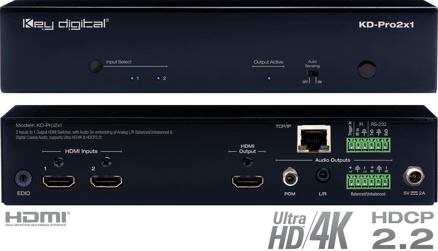 Key Digital Brand : KeyDigital KD-Pro2x1 2x1 HDMI Switcher, Audio De-embedding of Analog L/R Balanced/Unbalanced & Digital Coaxial Audio, Supports Ultra HD/4K & HDCP2.2 IR/232 TCP/IP & Supports KD APP
